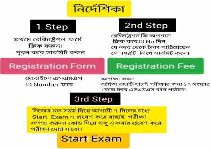* রেজিষ্ট্রেশন ফরম পূরণ করে পরীক্ষার ফি জমা দিন,পরীক্ষার কোড নম্বর সংগ্রহ করুন। পরীক্ষা দিন।